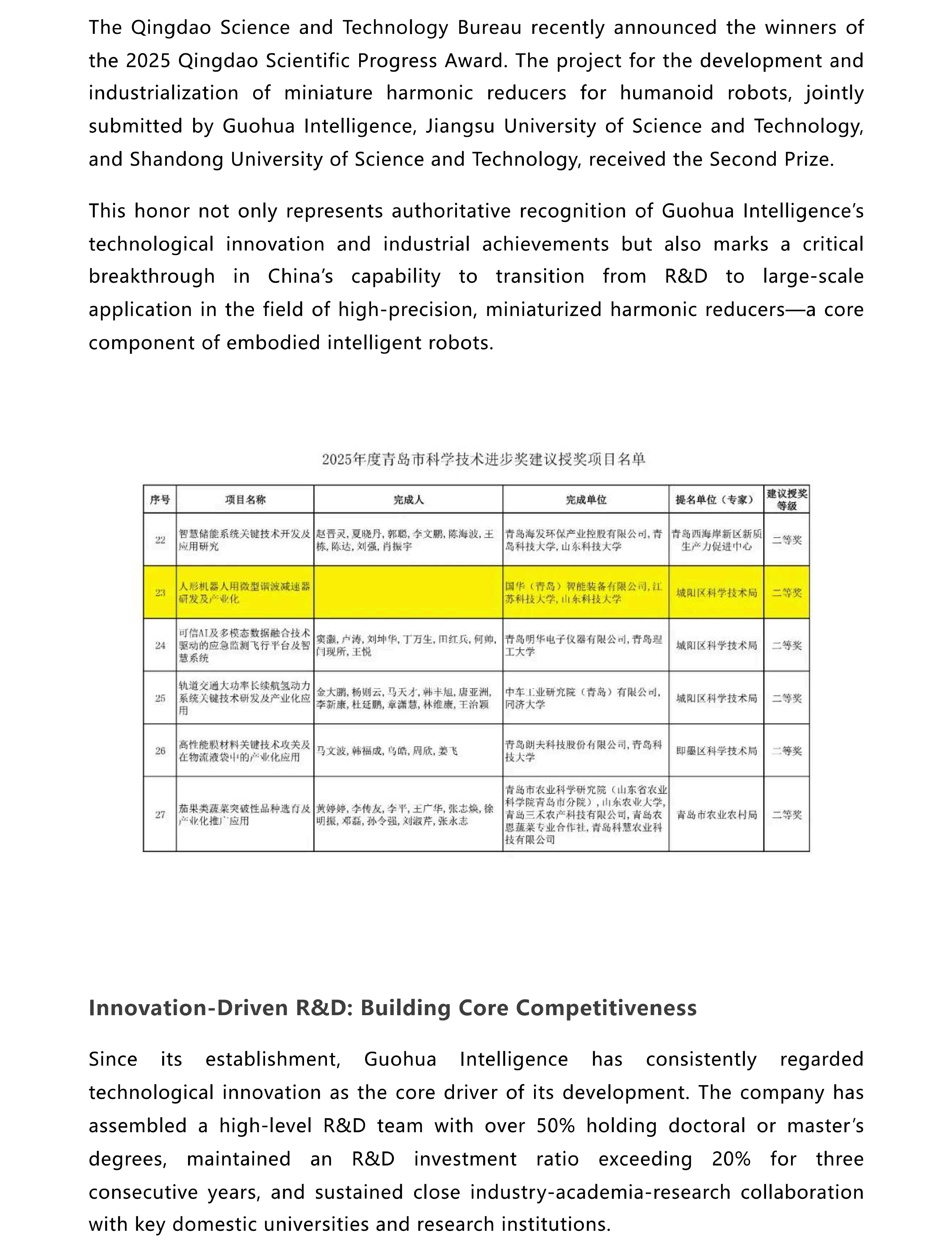 Guohua Intelligence Wins 2025 Qingdao Scientific Progress Award, Boosting Transformation of Embodied AI Industry