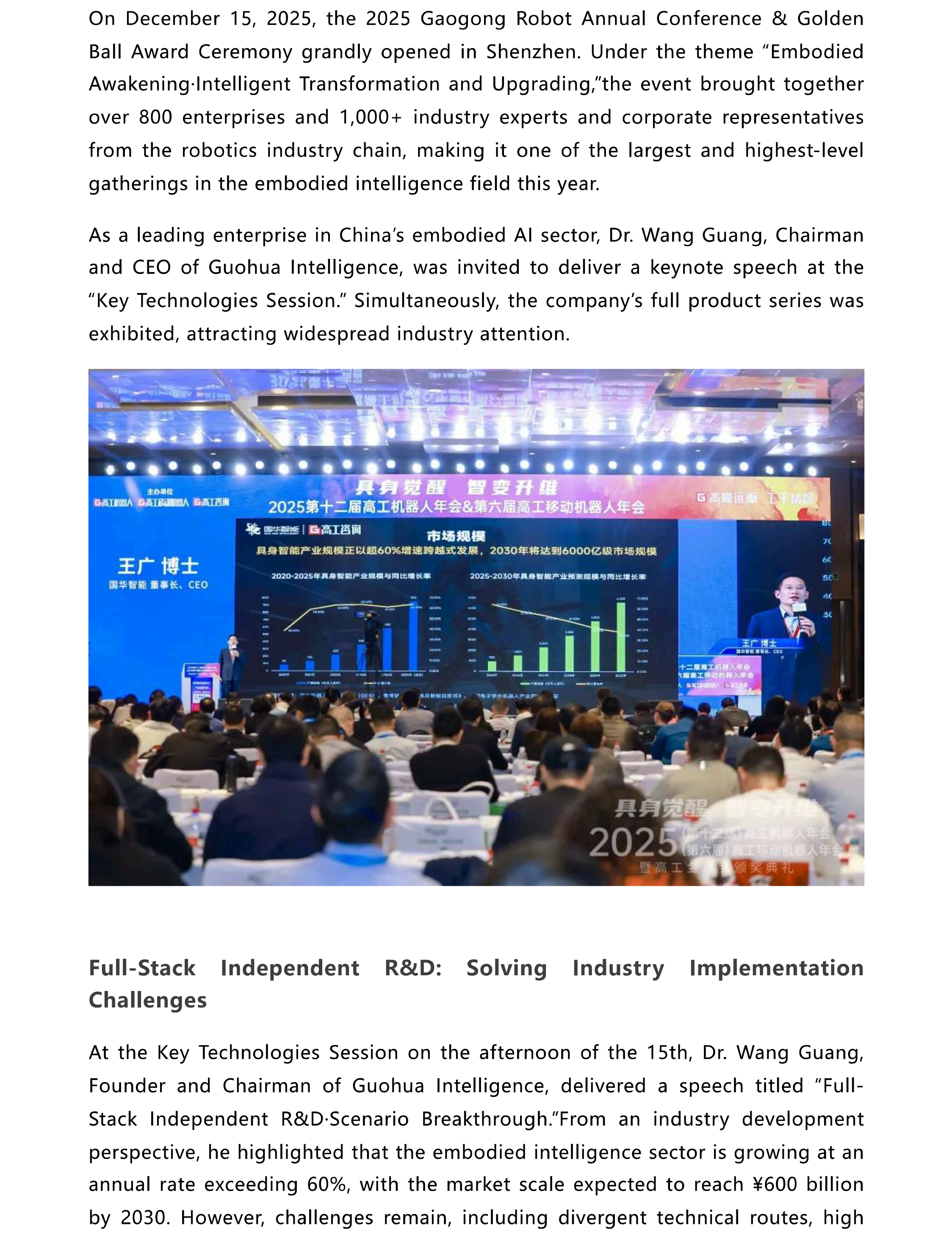 Guohua Intelligence Chairman Dr. Wang Guang Invited to 2025 Gaogong Robot Annual Conference, Sharing New Pathways for Embodied AI Implementation