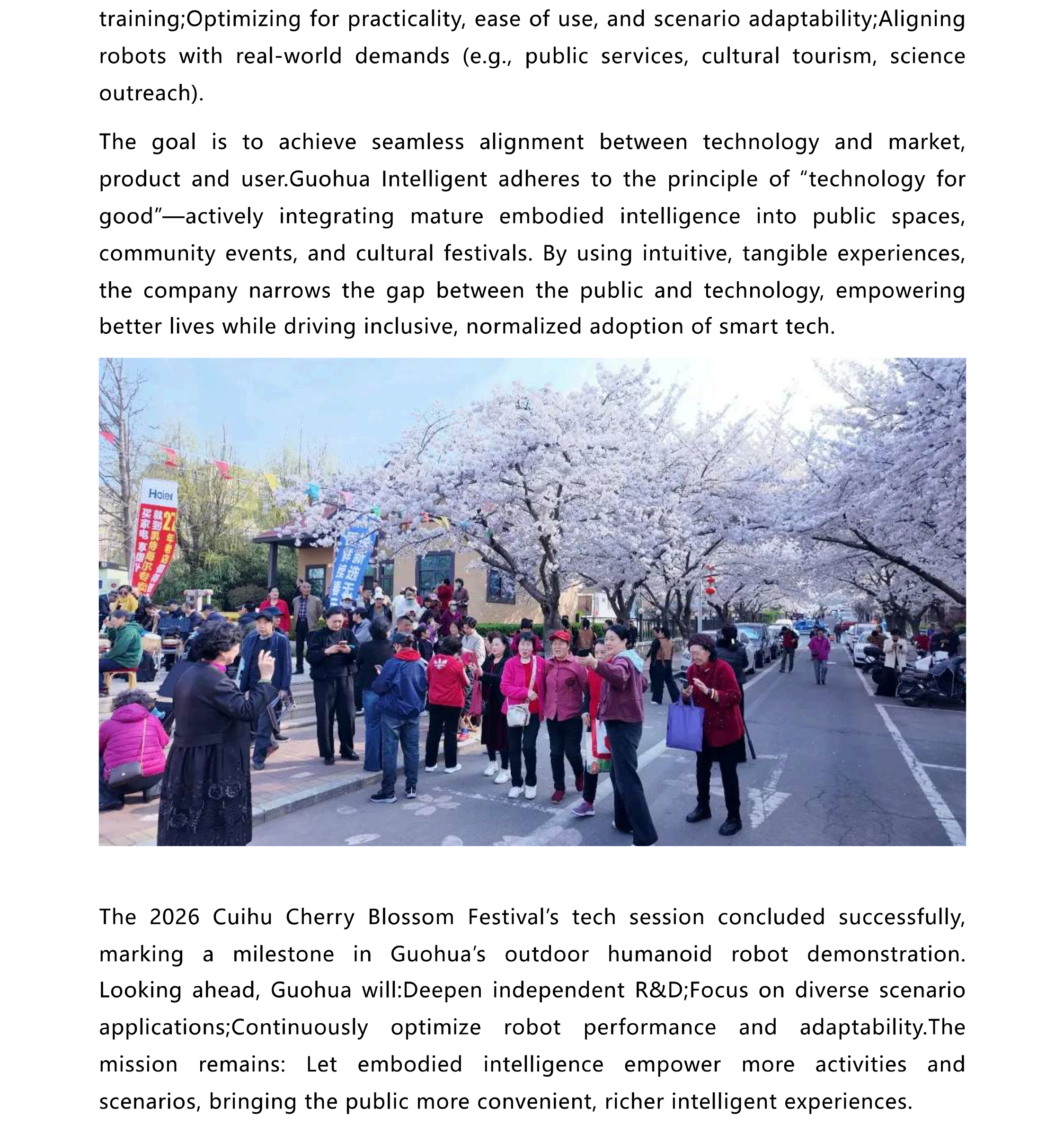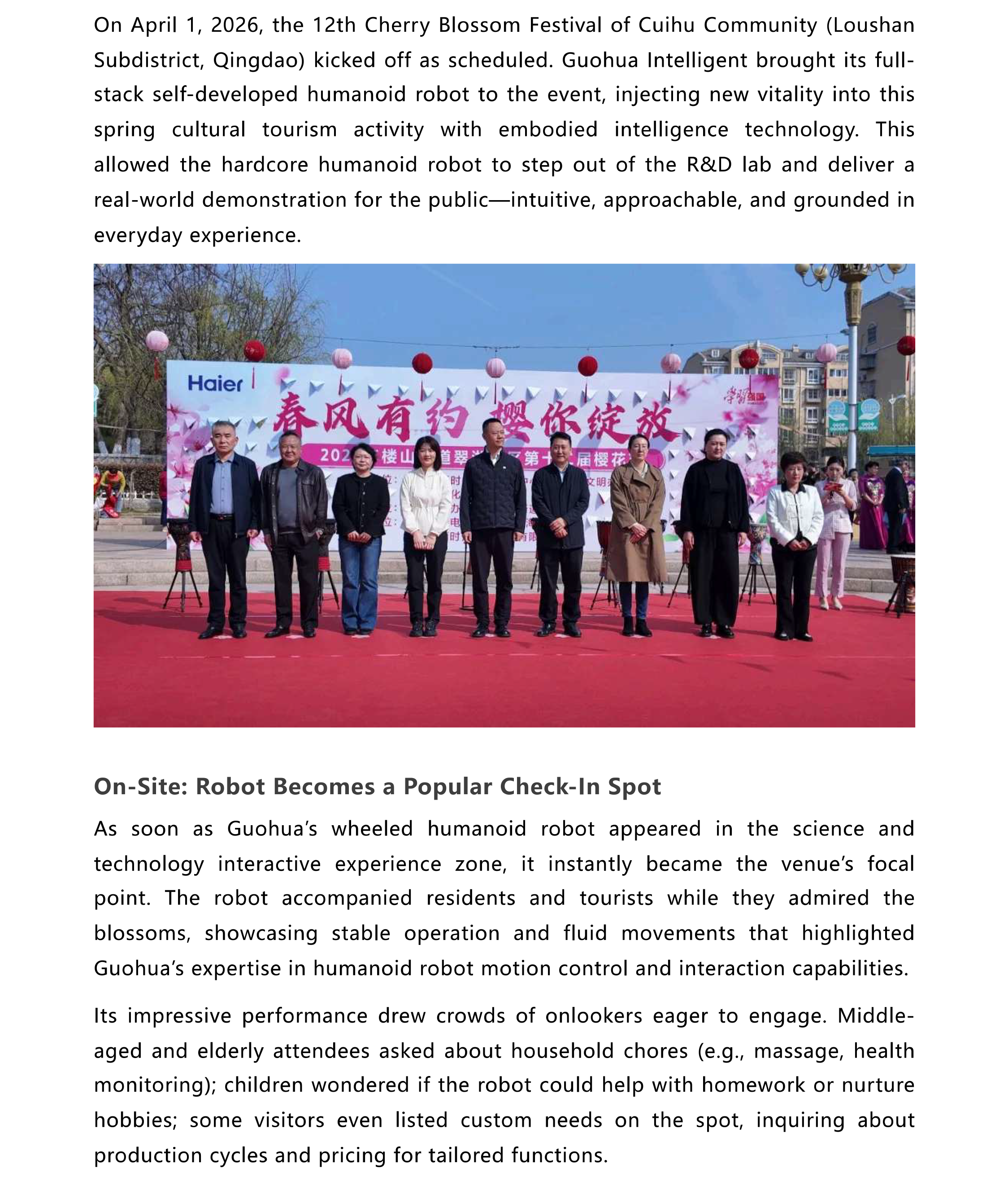 Guohua Intelligent's Humanoid Robot Debuts at Cuihu Cherry Blossom Festival, Empowering the Spring Event with Technology