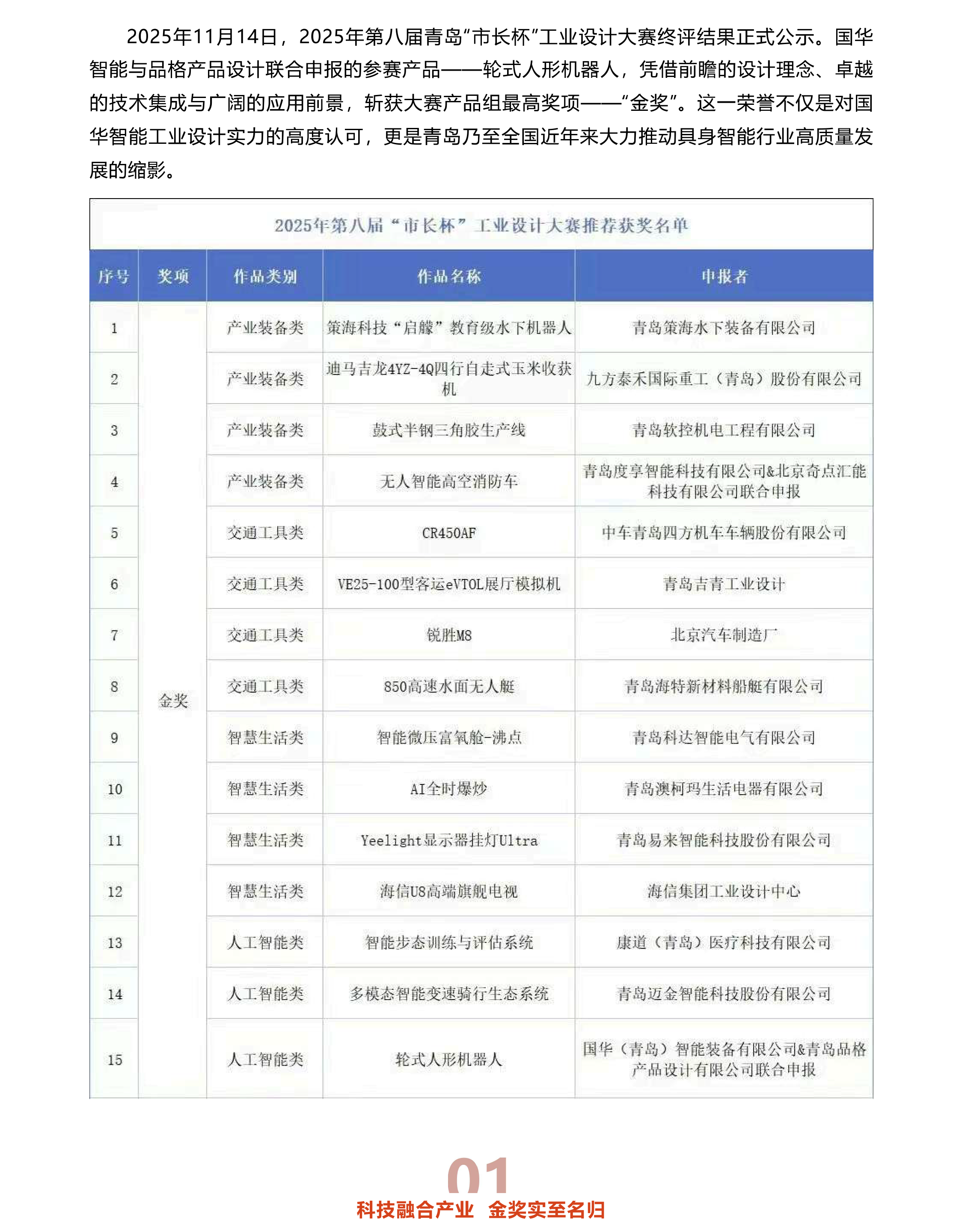 斩获金奖!国华智能轮式人形机器人摘得2025“市长杯”工业设计大赛最高奖项